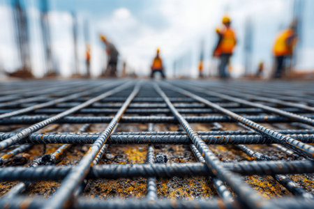 Focused steel rods stretch across the foreground, while busy workers in high-visibility gear move beneath an overcast sky, capturing the essence of construction momentum.