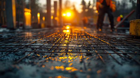 This image features a close-up of steel rebars placed on a concrete surface at a construction site, beautifully illuminated by soft evening sunlight, showcasing the essence of industrial work.
