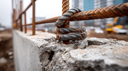 This close-up image captures a rusty reinforcement bar tied to a concrete block, showcasing construction elements at an ongoing site under overcast skies.