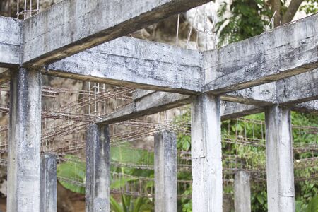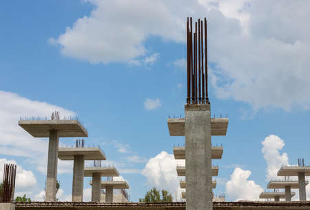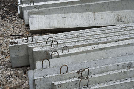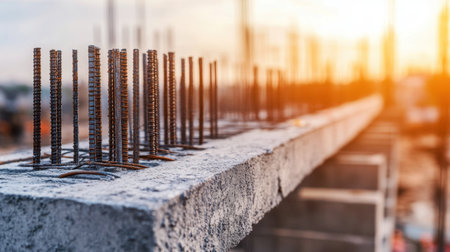 Detailed view of industrial construction site displaying concrete beams reinforced with steel. Focus on textures and structural elements vital for urban development projects.