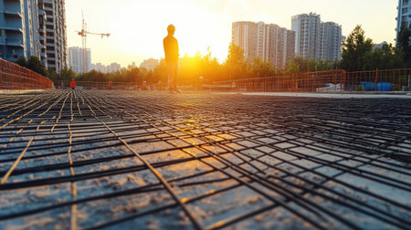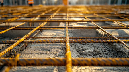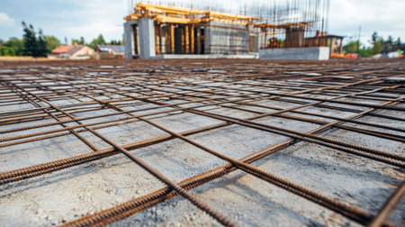 This image showcases an industrial construction site featuring a grid of steel rebars laid across a concrete surface, emphasizing strength and design.