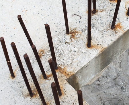 Rusty metal fittings, texture, against the background of gray concrete, construction, foundation of the house, screed, floor