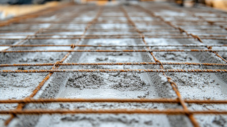 This image features a close-up view of a rusty steel rebar grid on a construction site, highlighting the intricate details of the metal framework against the concrete.