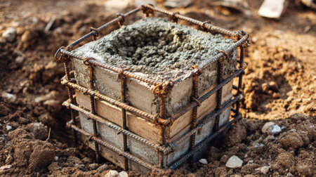 A square wooden formwork filled with freshly mixed concrete at a construction site, surrounded by soil and gravel. This image captures the essence of building foundations.