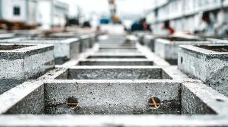 This image captures a close-up of concrete foundation blocks at a construction site, focusing on their intricate texture and layout in the building process.
