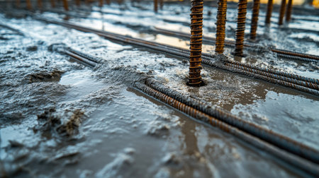 Close-up view of steel reinforcement bars embedded in wet concrete at a construction site, illustrating the key elements of structural integrity and progress in building projects.