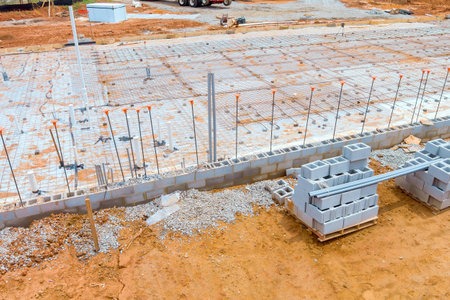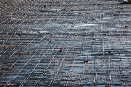 In preparation for concrete pouring, reinforcement metal framework has been poured over foundations