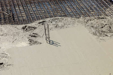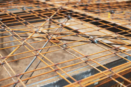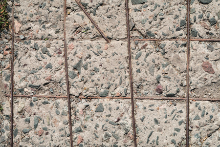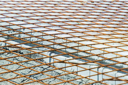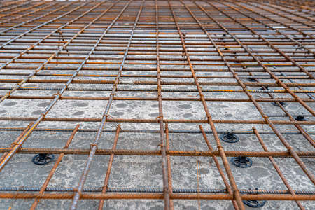 Iron metal rusty reinforcement in concrete and industrial reinforced concrete slabs used in the construction of buildings and structures.