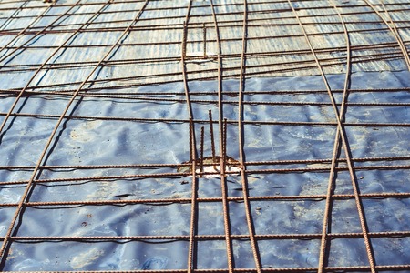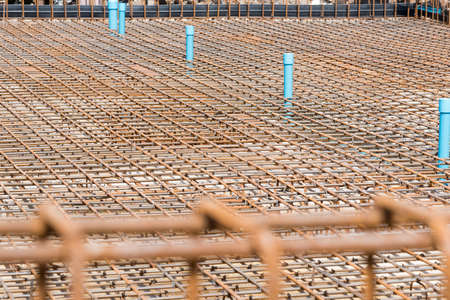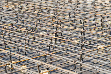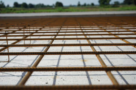 The steer wire mesh for concrete floor in construction site. Steel armature grids for pouring concrete in building foundation