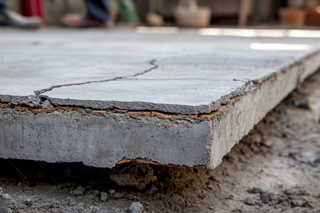 Weathered concrete panels rest atop rustic wooden frames, capturing the raw essence of construction progress amid earthy textures and rugged craftsmanship.
