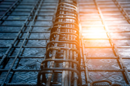 Close up view of reinforcement of concrete. Geometric alignment of Rebars on construction site. Reinforcements steel bars stack.
