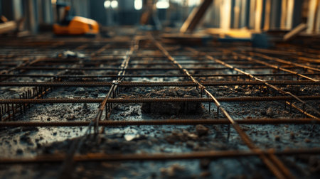close up and selective focus view of foundation reinforcement steel bars on wet cement ground, structure in an interior construction site.