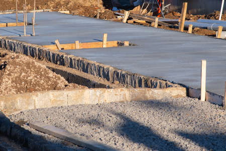Freshly Poured Concrete at Construction Site During Sunset. Concept of Building Foundations, Industrial Infrastructure, and Construction Progress.