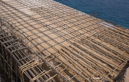 This image showcases an industrial construction site featuring a grid of steel rebars laid across a concrete surface, emphasizing strength and design.