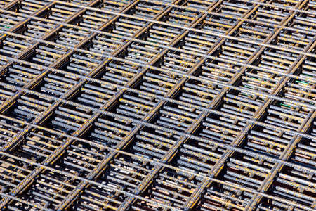 Close-up of steel rebar grid used for concrete reinforcement in construction. Showing a pattern of rusty bars, essential for building strength.