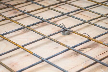 Rebars steel wire mesh, which is supported by mortar cover box and wooden plate for precast concrete flooring on construction site, selective focus.