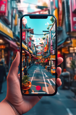 Travel apps for smartphone concept. Smartphone with blank screen on color travel background. Travel and tourist apps