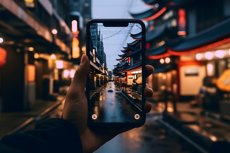 Female hands holding smartphone taking picture of city with beautiful sunset sky. Sightseing concept.