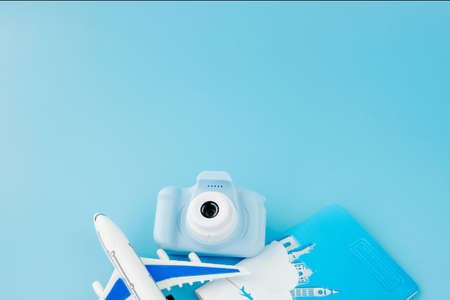 Camera, passport and airplane on light blue background. Summer or vacation concept. Copy space