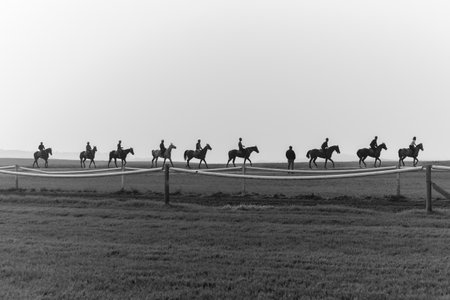 Race horses groom riders training silhouetted black and white landscape.
