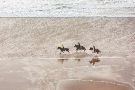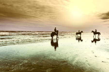 People horse riding on the beach, aerial view - Three people with horses on seashore at sunset - Sport, leisure and travel concepts