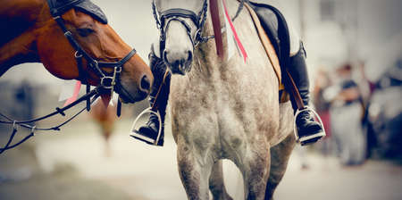The muzzles of two horses of the winners of the competition. Portrait sports stallions in the bridle after the competition with premium rosettes. Dressage of horses. Equestrian sport. Horseback riding.