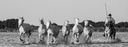 PROVENCE, FRANCE - 08 MAY, 2015: Rider on the horse graze Camargue horses in the swamp nature reserve in the Parc Regional de Camargue - Provence, France