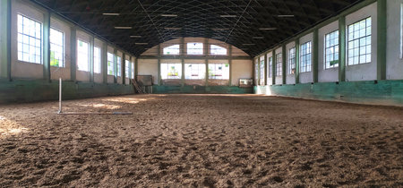Empty indoor riding hall center for horses and riders. The riding school is suitable for dressage and jumping horses. Covered arena building interior without people ready for equestrian training