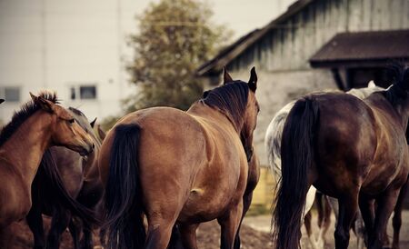 A herd of horses returns home from the field to the stables.