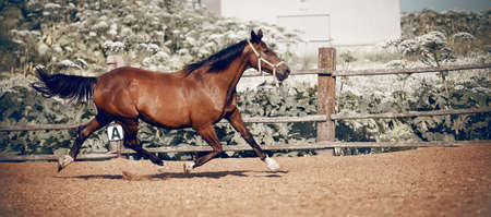 Beautiful young purebred horse runs across empty riding hall during training