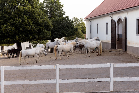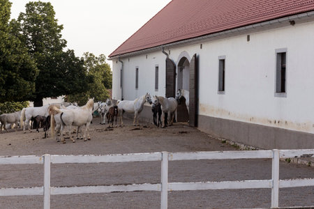 White Lipizzan horses with its foal outside the stable, grazing in the pasture, Lipica. Slovenia