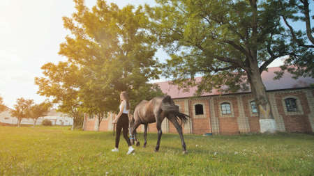 A girl in the form of a jockey rides a horse at the hippodrome. Horseback riding lessons, horseback riding