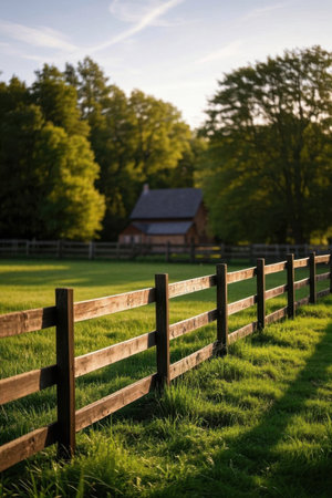 Rustic wooden fence and distant cabin scenery