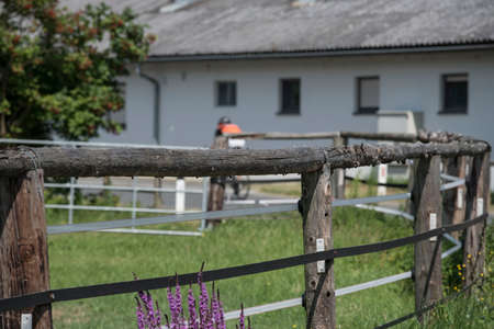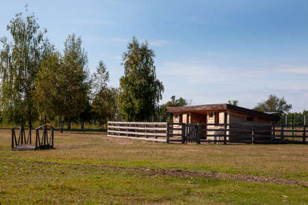 horse barn standing near the forest on a sunny afternoon
