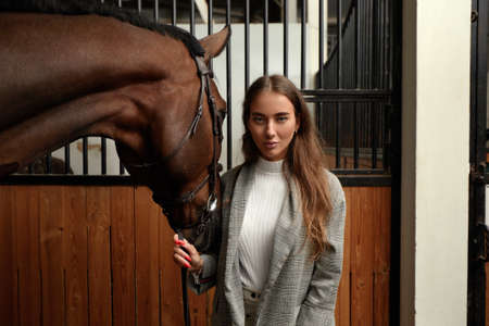 portrait beautiful woman long hair next horse