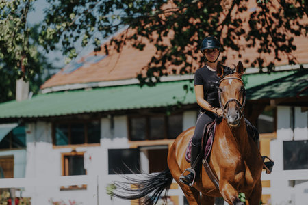 Young woman riding horse at an outdoor equestrian facility