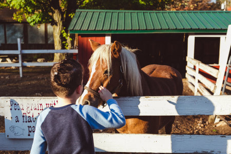 Little boy stroking a horse in a paddock on a farm