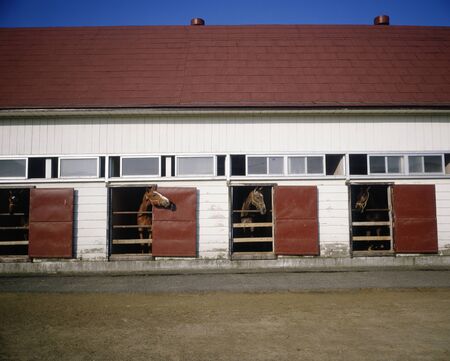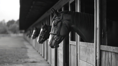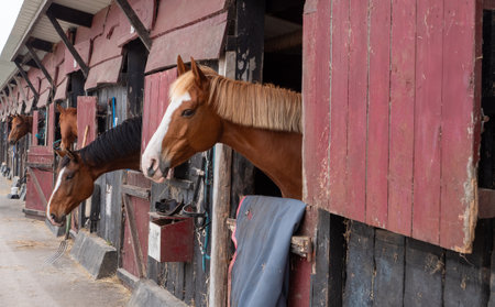 Several horses with bridles peer out from their stalls in a stable. The atmosphere is calm, and the sky is overcast, creating a serene setting for the equines