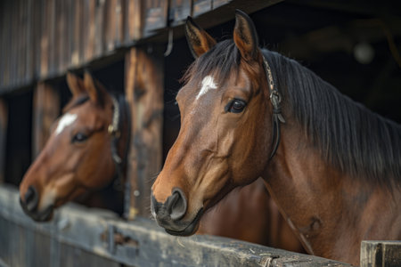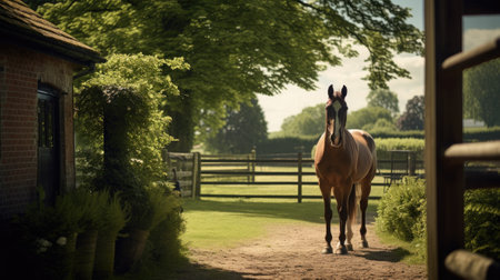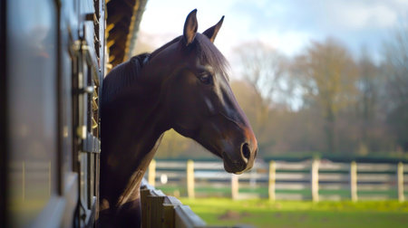 A clean and tidy stable showcases a majestic stallion peering out from his stall. The rustic wooden structure adds charm to the serene atmosphere with fresh straw in view.