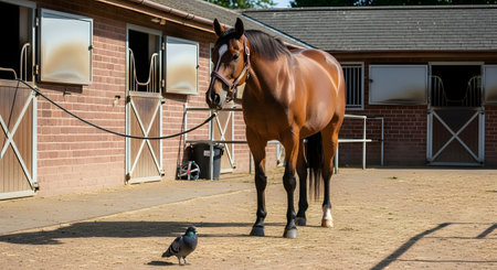A beautiful brown horse stands calmly in a sunlit stable yard paved with dirt and straw, looking down at a pigeon walking nearby. The scene captures a quiet moment of interaction between animals in a rural equestrian setting.