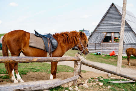 Pet horse in the paddock at the farm. Pets on a summer day.