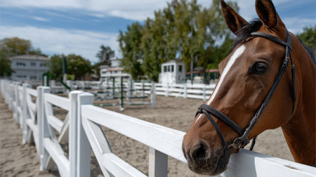 A stunning brown horse stands gracefully by a white fence in an equestrian facility. The vibrant blue sky and lush surroundings create a serene atmosphere, perfect for capturing the beauty of rural life and equine charm.