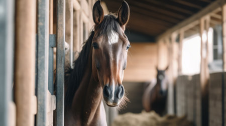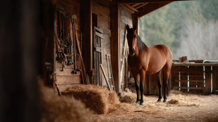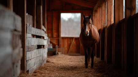 A warm interior shot of a wooden barn with a beautiful horse standing gracefully inside its stall