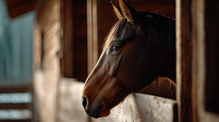 An artistic composition of a horse standing in profile inside a detailed wooden stall, ambient barn mood