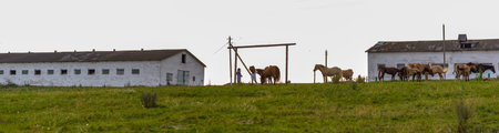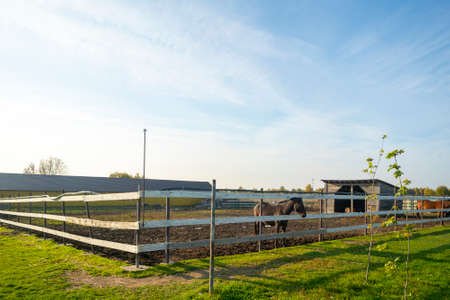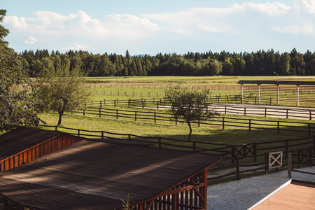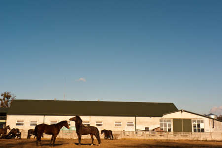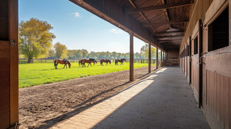 View of a horse stable on a sunny day, with grazing horses in the distance and plenty of copy space.