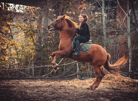 Young beautiful brunette girl rides a horse on a warm and sunny autumn day. Portrait of a pretty young woman on the horse, wearing tall boots and gloves.