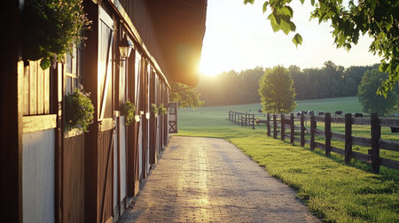 A peaceful farm scene captures the beauty of a sunset illuminating a barn and pathway. The tranquil atmosphere invites reflection amidst lush greenery and golden light.