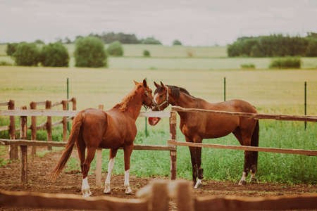 Two bay horses communicate with each other while standing in the paddocks on the farm in the summer. Horses on the background of a field. agriculture and livestock. horse care.
