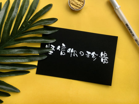 Chinese calligraphy on a black sheet of paper on a yellow background