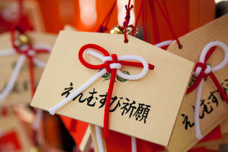Decorative Japanese tables with personal wishes hanged at a temple